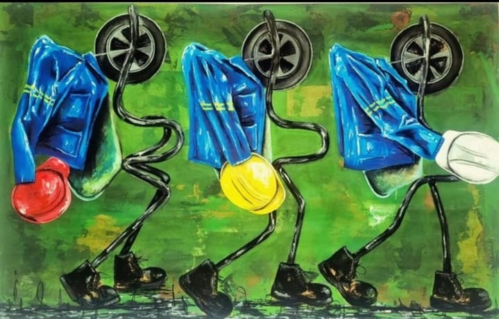 Tinyiko Malusi is Currently working on the wheelbarrow series. Artworks that symbolise the human experience of drawing strength from life’s burdens, using the metaphor of a wheelbarrow. The central focus is on a person pushing a heavily loaded wheelbarrow. representing the challenges and the responsibilities we carry. the weight becomes overwhelming, mirroring life’s struggles. the wheelbarrow acts as a metaphorical vessel for burdens, showcasing that even when faced with adversity, an internal force propels us forward. this project aims to convey the idea that, just like a wheelbarrow in motion, life keeps moving forward.